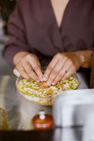 Chef Rasheeda Purdie adds toppings to her Breakfast Ramen at Ramen by Ra.