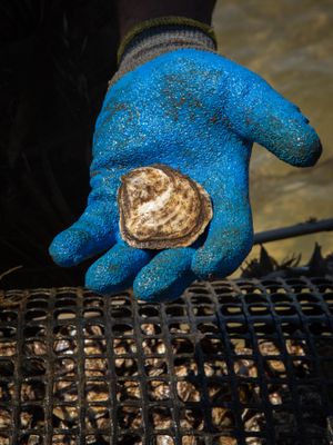 Oyster farmer Marcus Buffaloe presents a Baby Brielle, fresh from the water in the Great South Bay, Long Island. Buffaloe named his first style of oysters at Deep Water Oyster Farm after his daughter.